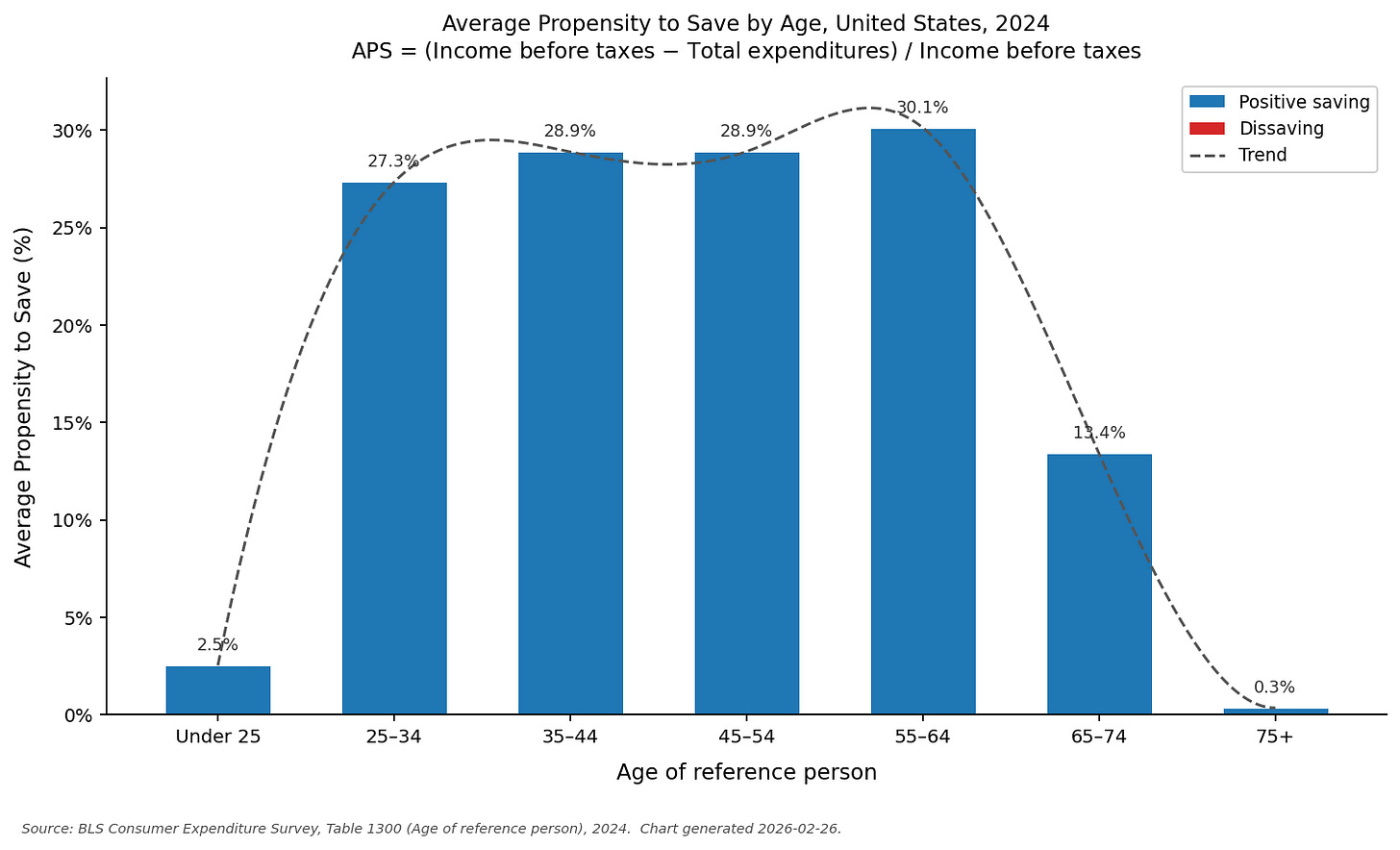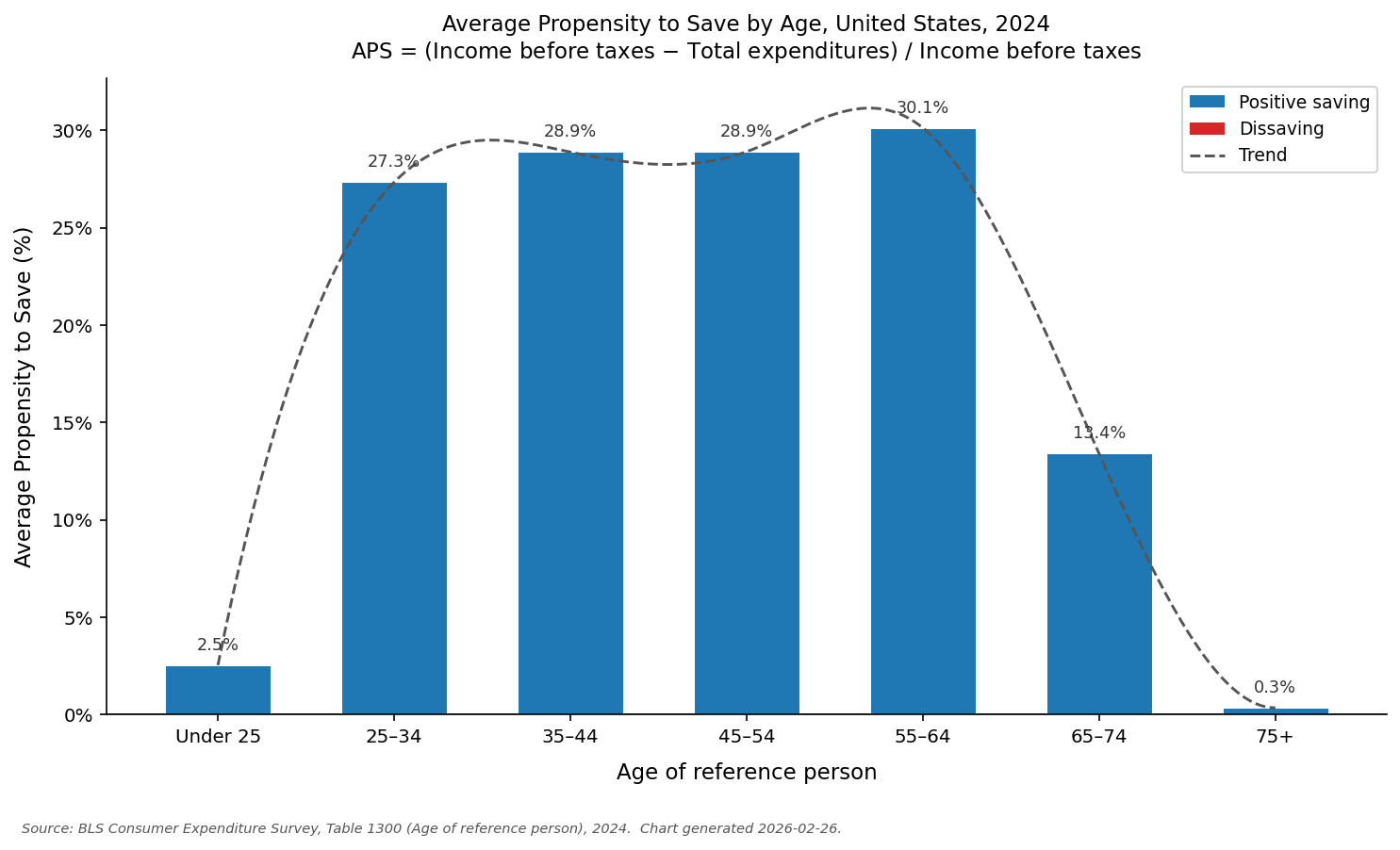 The structural persistence of Q2 and Q3 dissaving. Q1 dissaving has a partial lifecycle explanation. The bottom quintile contains disproportionate numbers of young households borrowing to invest in human capital—education, skills, initial homeownership—and older households drawing down retirement savings. Both behaviors are consistent with rational lifecycle planning in a well-functioning economy. Figure 1, which shows average APS by age of household reference person for the United States (2024, BLS Consumer Expenditure Survey), confirms that the lifecycle hump is real: mean APS rises from +2.5% for households under 25, peaks at +30.1% for the 55–64 bracket, then declines as households enter retirement.