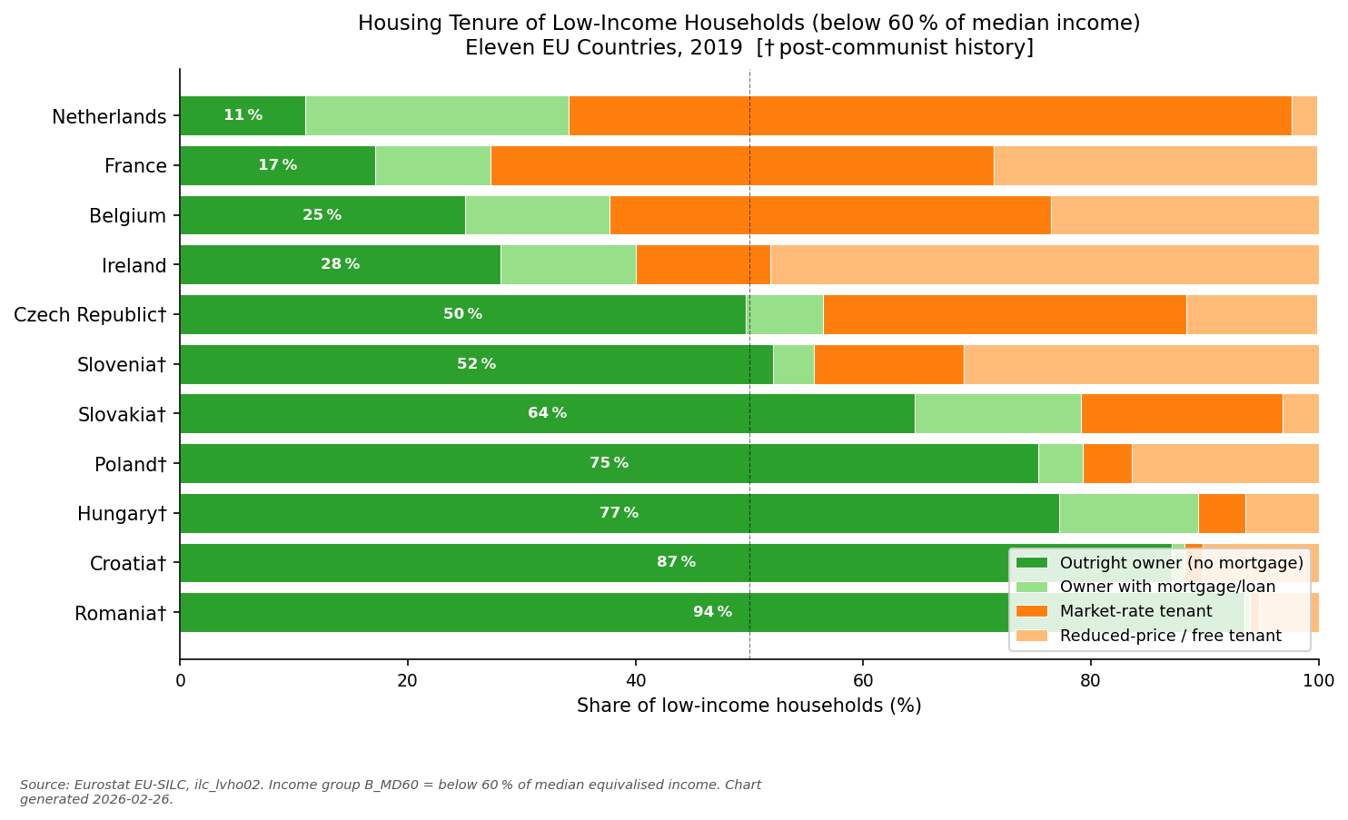 Figure 4 quantifies the tenure difference. Among households below 60% of median income in 2019, 49.7% of Czech households own their homes outright (no mortgage), compared with 25.0% in Belgium, 28.1% in Ireland, 17.1% in France, and 11.0% in the Netherlands. The contrast with the broader post-communist cluster is equally striking: Romania (93.5%), Croatia (87.1%), Hungary (77.2%), and Poland (75.4%) all show even higher outright ownership among low-income households, confirming that the Czech result is part of a systematic regional pattern.