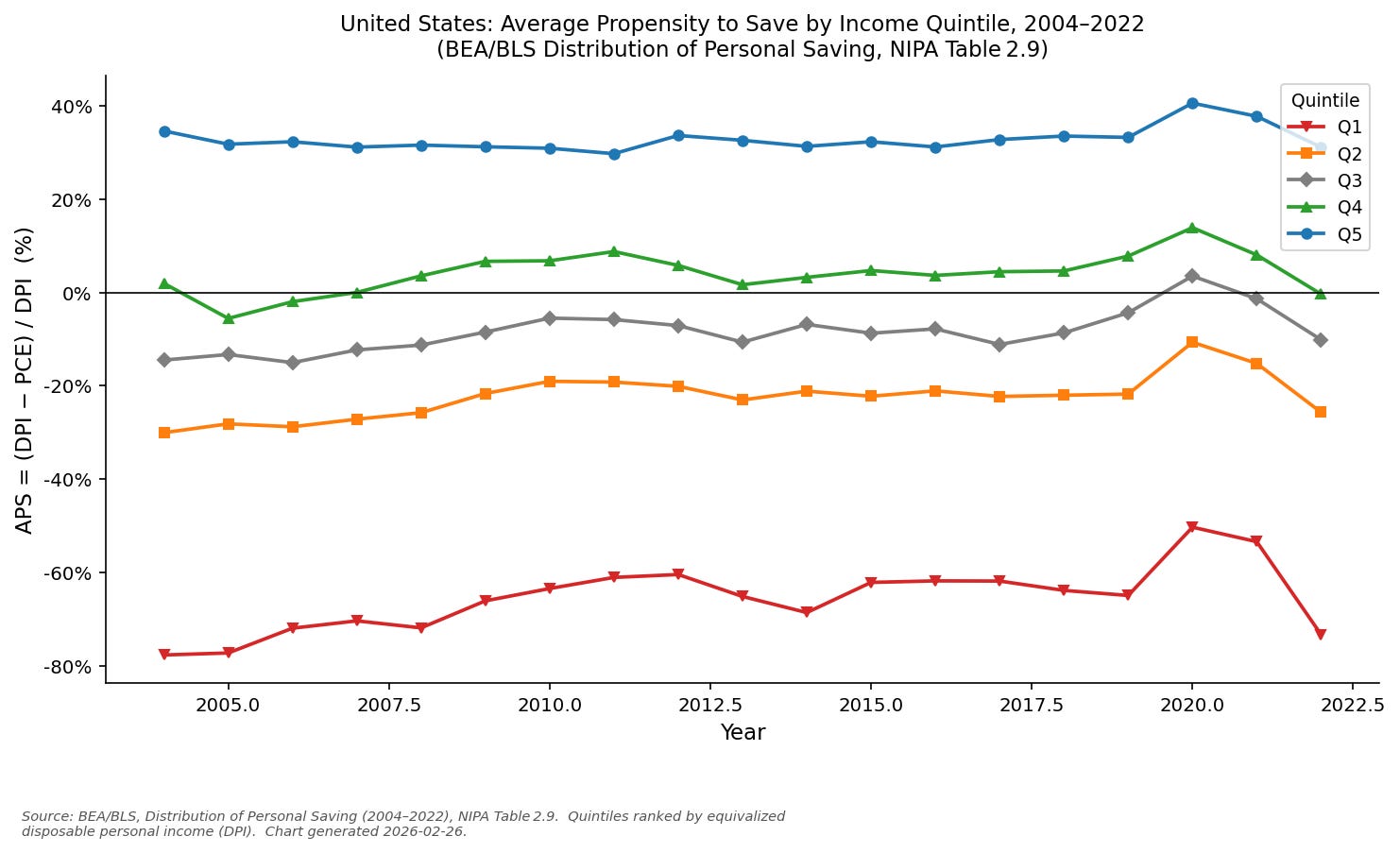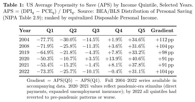 One important operational measure of whether that pathway is open is the Average Propensity to Save (APS): the fraction of income that households save rather than consume. If capitalism is working, APS should be positive—or at least not deeply negative—across the income distribution. Structural dissaving means that a household is spending more than it earns, year after year, sustained by borrowing, asset liquidation, or transfer from others. It is the arithmetic negation of the Lincoln pathway.