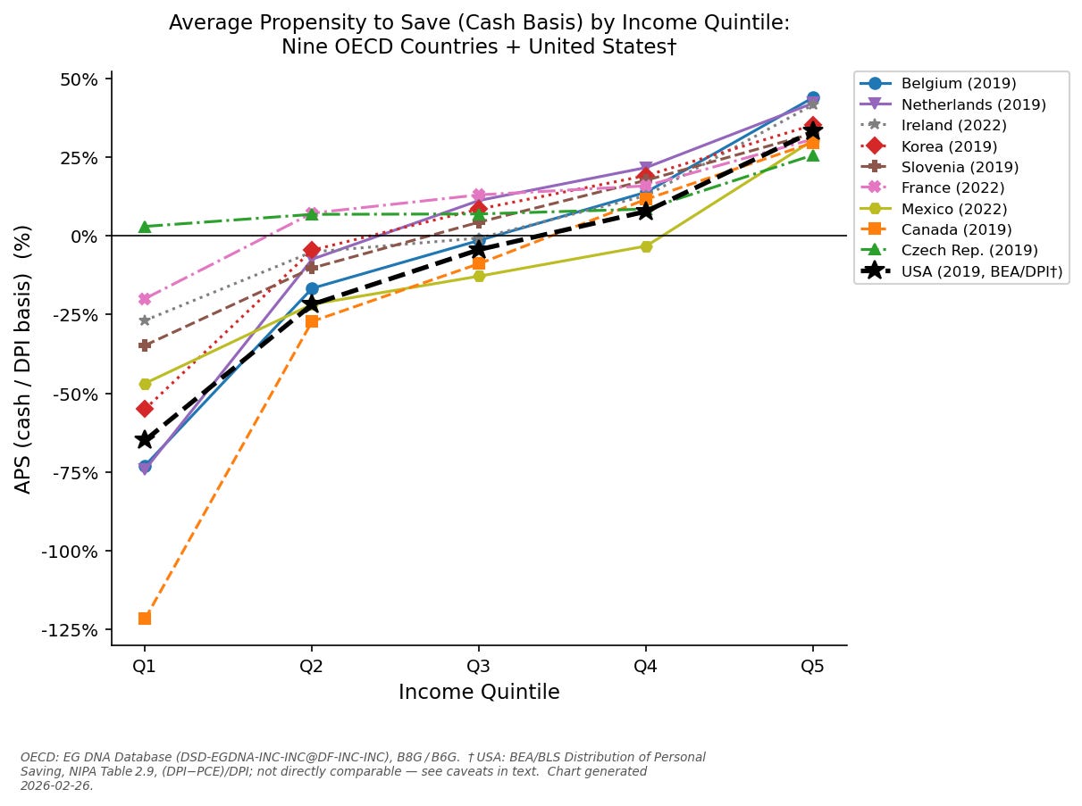 3 OECD data for nine countries are drawn from the OECD Experimental Statistics on Household Distributional Accounts (dataflow DSD_EGDNA_INC_INC), accessed via the OECD SDMX REST API. The APS shown is the adjusted basis: APSadj=B8G/B7G, where B8G is gross saving and B7G is gross adjusted disposable income including Social Transfers in Kind (D63). Reference years: 2019 for Belgium, Canada, Czech Republic, Korea, Netherlands, and Slovenia; 2022 for France, Ireland, and Mexico. Cross-country comparability caveats: (1) The US DPI concept excludes D63; the closest OECD comparator is the cash basis (B6G), so the US gradient shown is somewhat narrower than a fully comparable figure would be. (2) France’s P41 submission covers cash consumption only (P3), making its adjusted-basis APS not directly comparable to other countries. (3) Quintile equivalisation scales differ across datasets. Despite these caveats, qualitative conclusions are robust: the US gradient of +98 pp would be wider, not narrower, on a fully comparable cash basis; Czech Republic’s positive saving at every quintile is confirmed on both adjusted and cash bases.